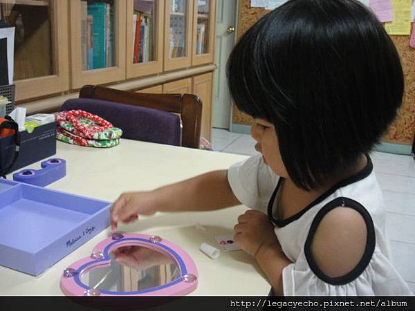 當阿公與亮亮一起讀完繪本,換阿嬤和亮亮做勞作了,讓亮亮在鏡子的木框上,貼上一顆顆閃閃發亮的玻璃水晶。