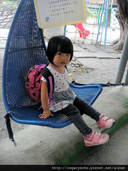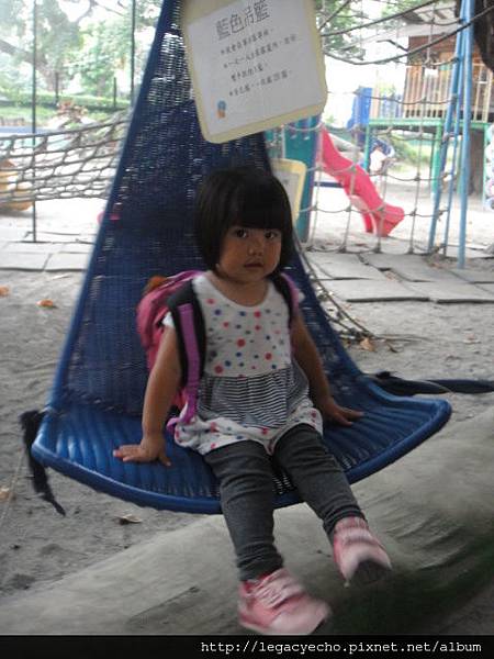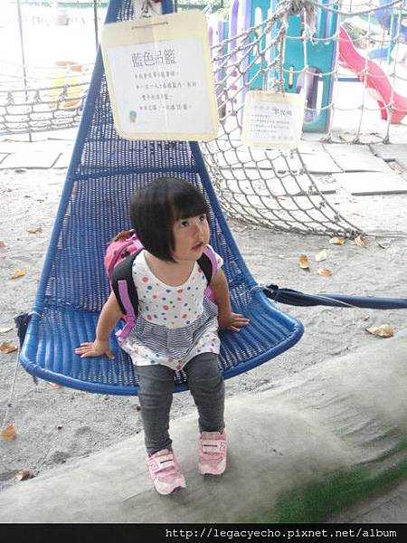 上學第二週的亮亮表現得獨立,放學時,請阿公幫助她坐一下藍色吊籃,搖一搖,刺激一下平衡中樞,再回家。