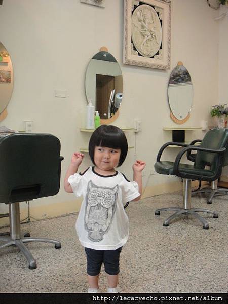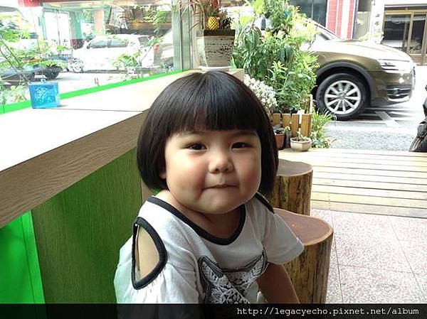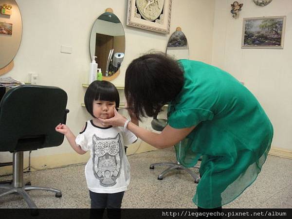 妹妹頭的前額劉海又長了,請詠綺姨婆幫忙修剪一下。