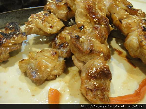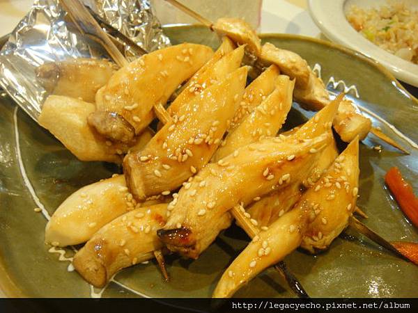 多種串燒料理可選擇,杏鮑菇與雞肉留下照片,骰子牛肉串燒來不及紀錄,早已盤底淨空。