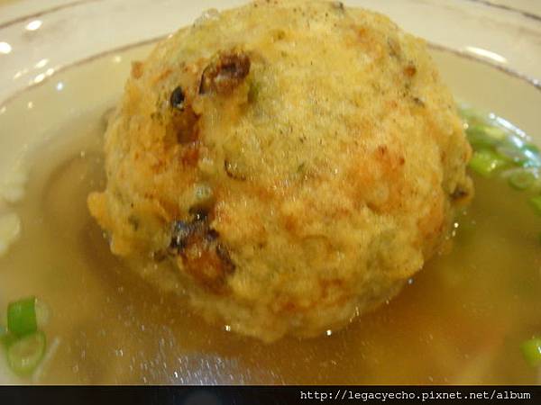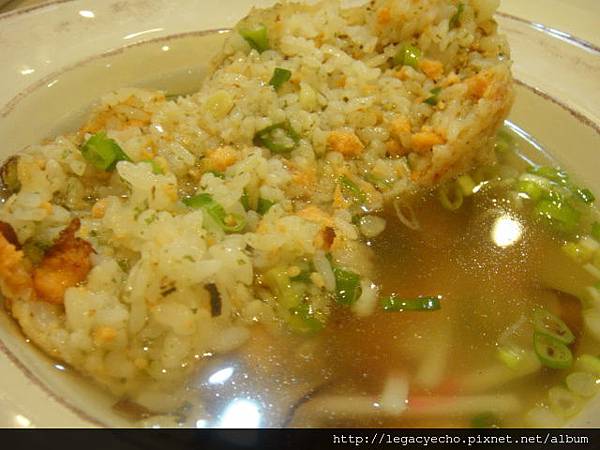 值得一嚐的鮭魚炸泡飯,鮭魚飯糰裹上少許麵糊油炸卻不油膩,柴魚高湯鮮美。