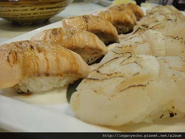 炙燒鮭魚腹握壽司、炙燒生干貝握壽司,炙燒比目魚握壽司。
