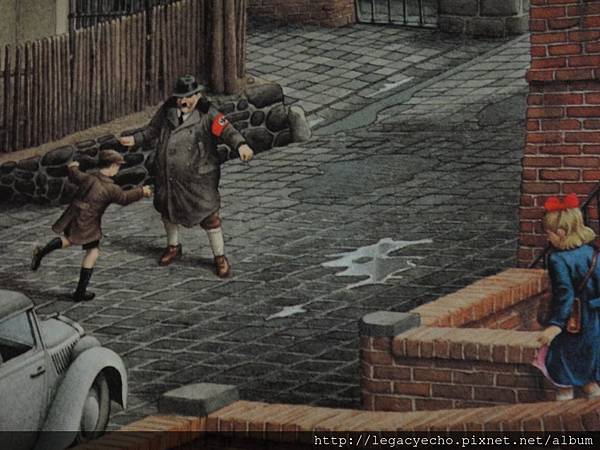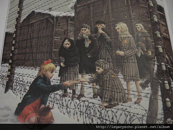 忽然發現一大片鐵絲網圍著的小木屋,裏面有一群瘦骨伶仃的小孩,他們穿著條紋衣服,衣服上有個星星記號。