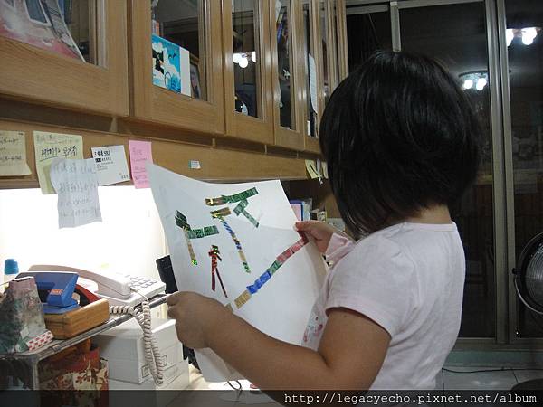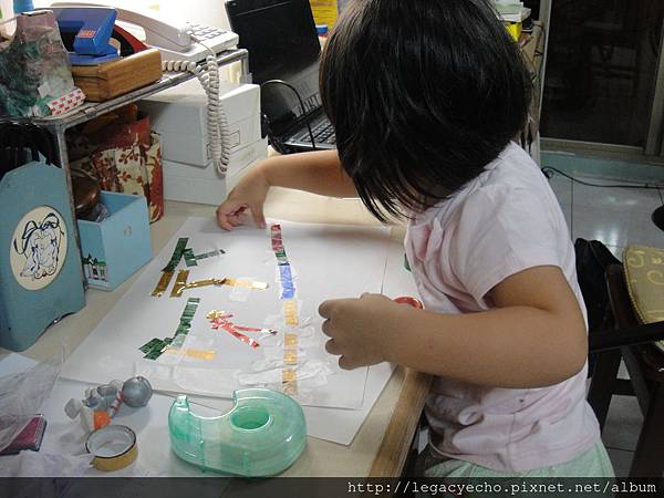 幾段亮晶晶的彩色膠帶、一捲掛在膠帶台上的隱形膠帶,一張圖畫紙,亮亮自己貼著貼著...,偶爾自言自語。