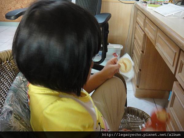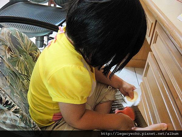 亮亮很在乎香蕉上面的蝴蝶結,剪蝴蝶結時,特別細心。