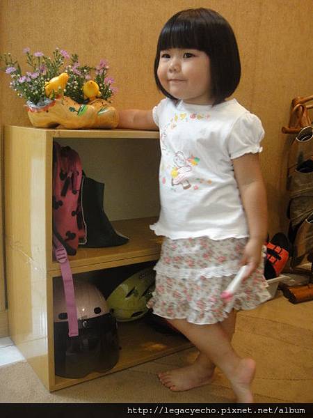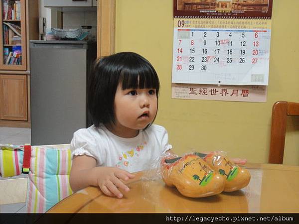 亮亮看到木鞋時也很想這麼做,但因為現在我們住在樓上,不像以前亮爸爸小時候住在一樓,如果木鞋在地板叩叩會吵到樓下的鄰居,所以阿嬤將木鞋定義成裝飾擺設品。