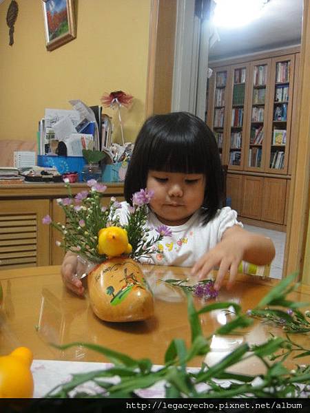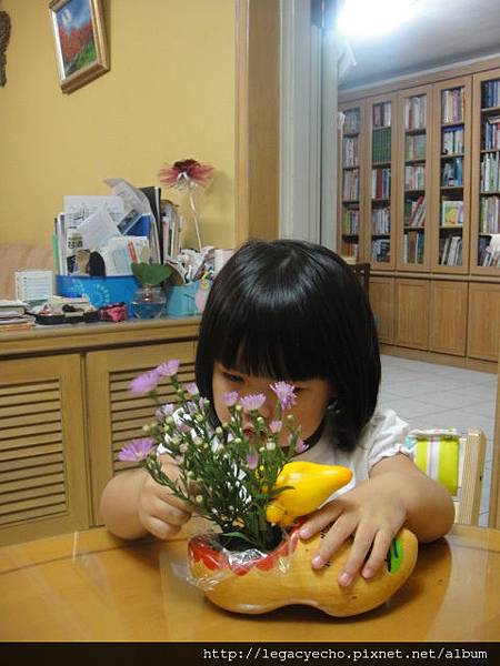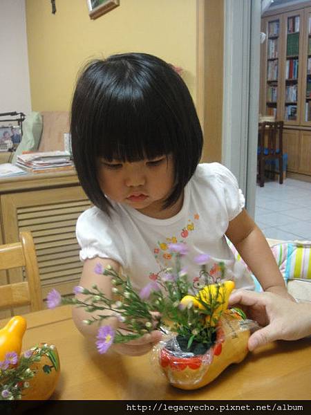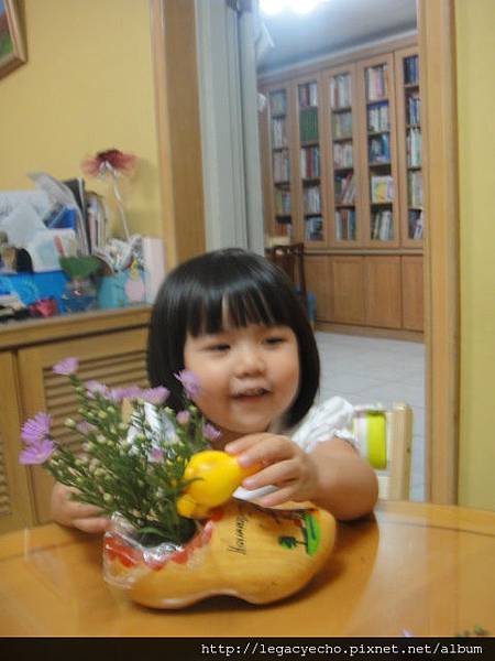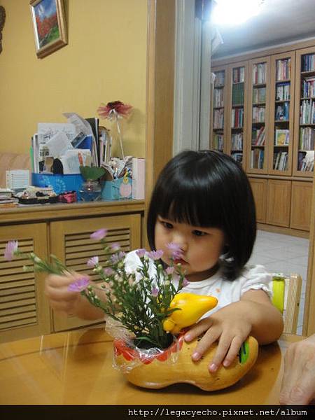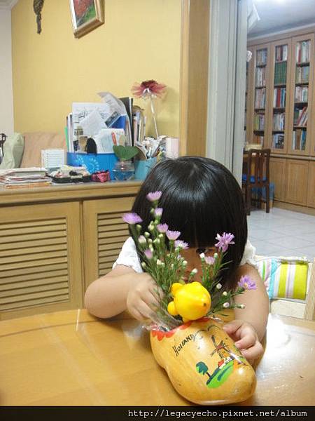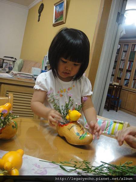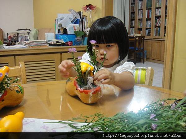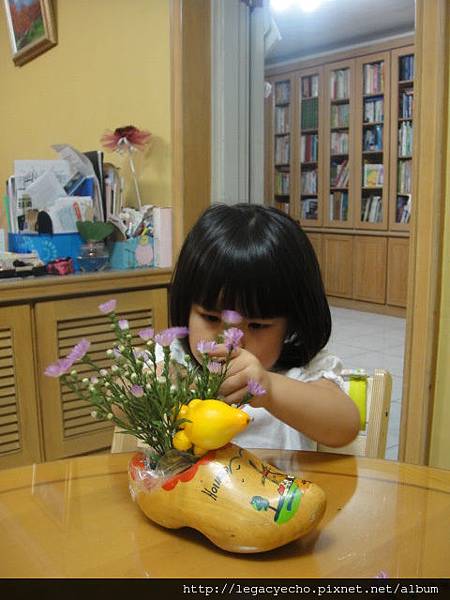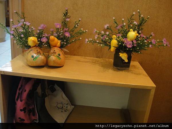 木鞋放在玄關的櫃子上,亮亮還是很好奇,很想穿看看。於是為了強化裝飾的意涵,阿嬤決定請沿穗婆婆準備花藝課程用花時,順便為我們準備一些小花,和亮亮一起玩花卉裝置。