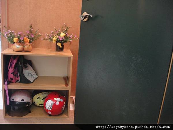 這個櫃子是為亮亮預備的,讓放學回家的亮亮有擺放書包便當袋及安全帽的地方。
