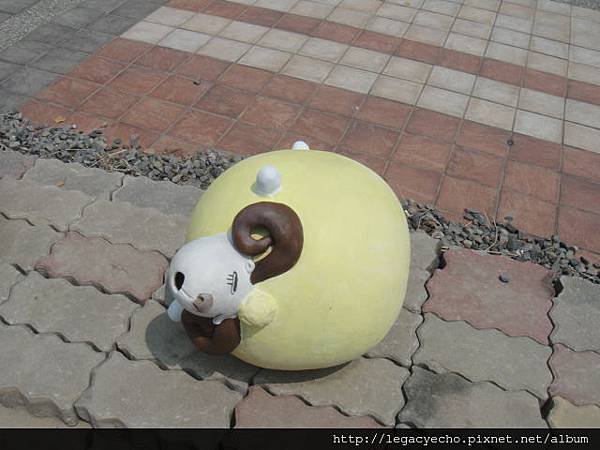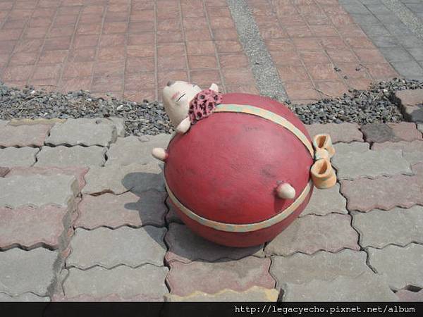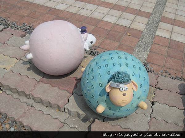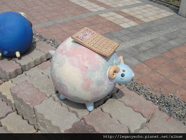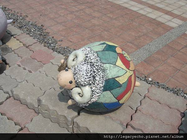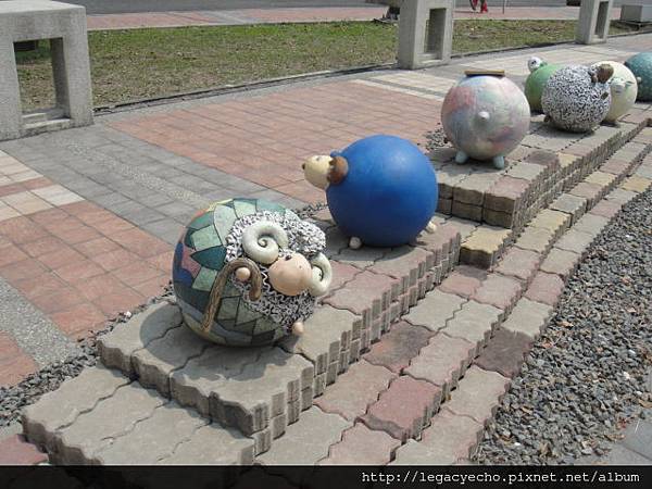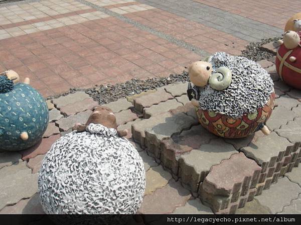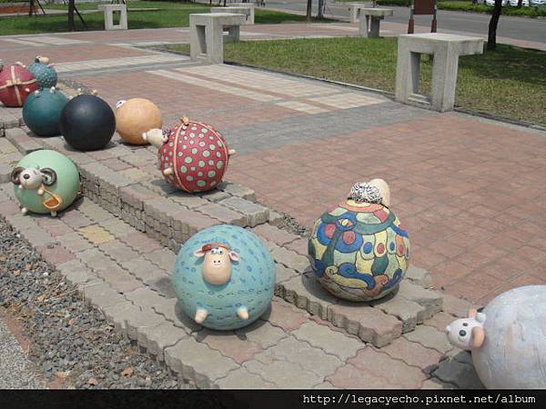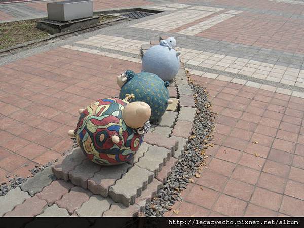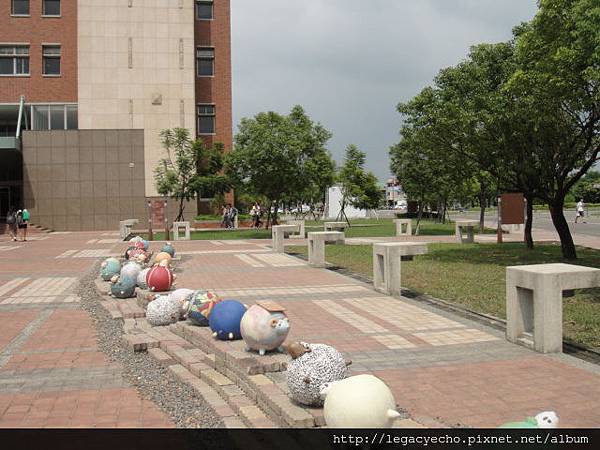 在停車場遠觀行政大樓前的小雕塑,還以為是一群小豬,直到月伶老師介紹才知是美術系同學的陶作。