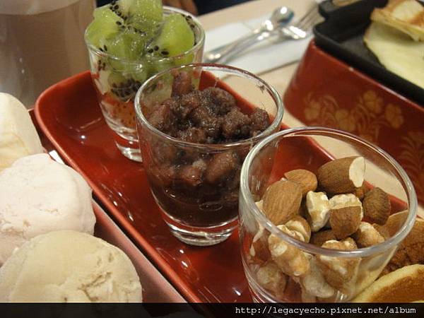 可麗餅、楓葉鬆餅與各種口味的迷你球冰淇淋,水果、堅果、紅豆,盛放在精美的漆盒中,秋季限定的款式。