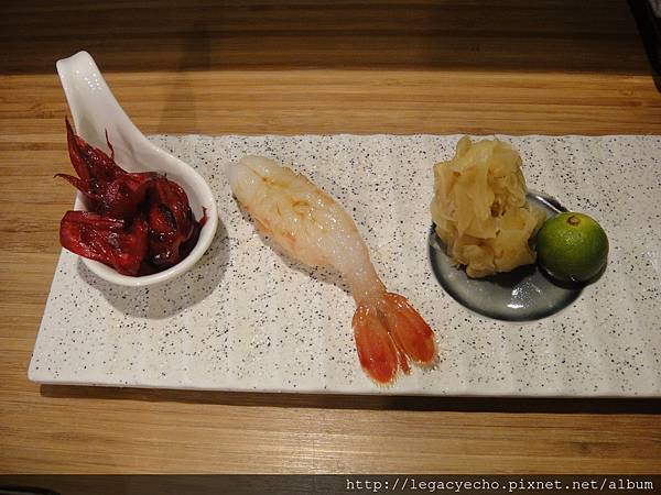 用糖蜜洛神花襯牡丹蝦握壽司,用洛神花的甜脆口感給味蕾甦醒的刺激,再享用牡丹蝦的Q彈,迥異的甜味讓牡丹蝦的鮮味清晰。