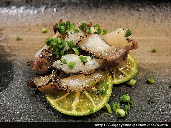 美味會使口欲提升,小鮑魚薄切炙烤,置於金桔薄片上,飾以細蔥,淺淺的嚼勁,讓娓娓食來的咀嚼滿足嘴饞。