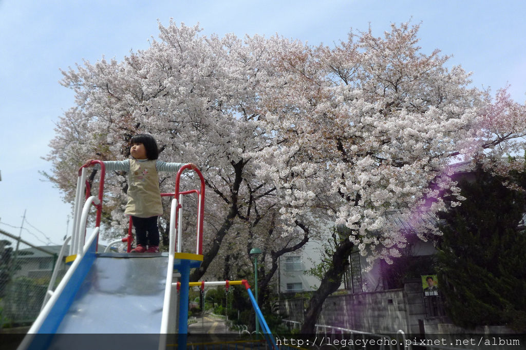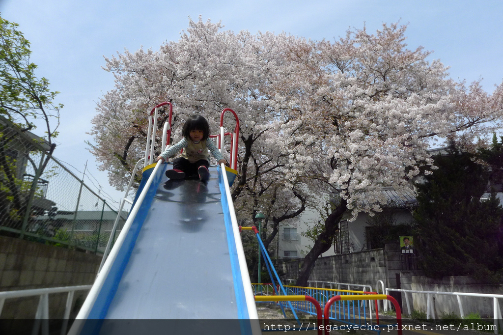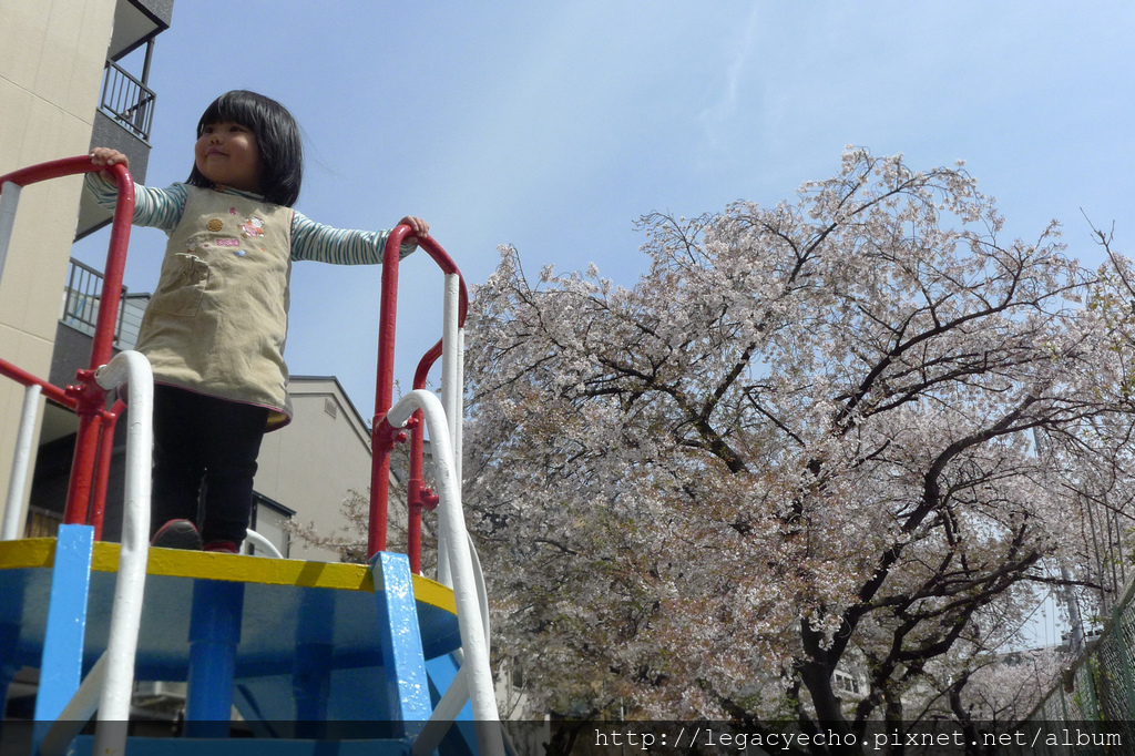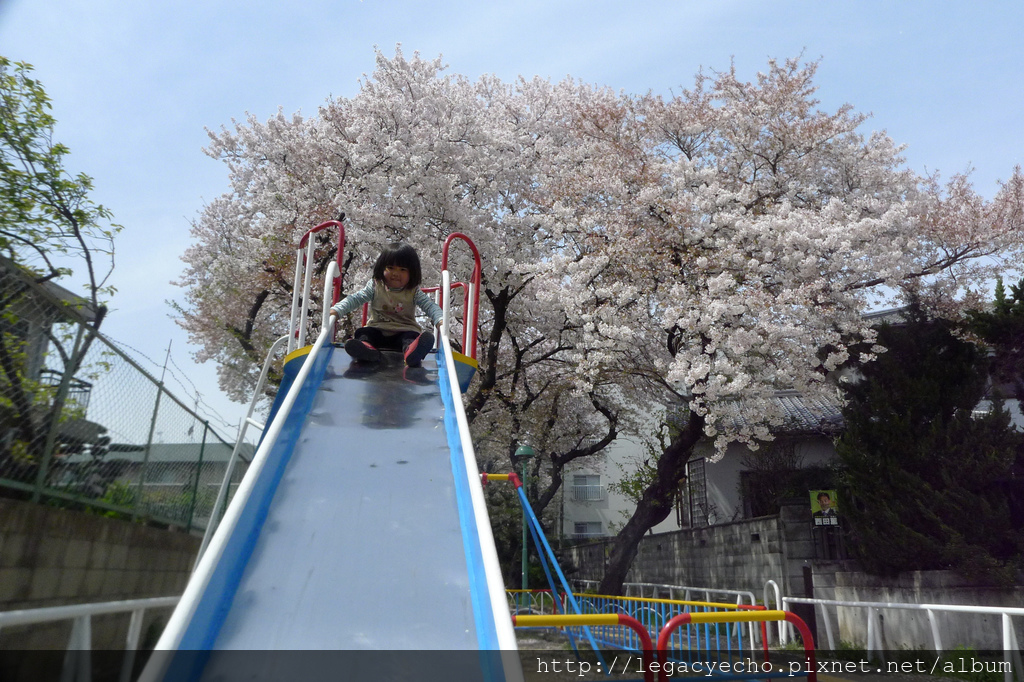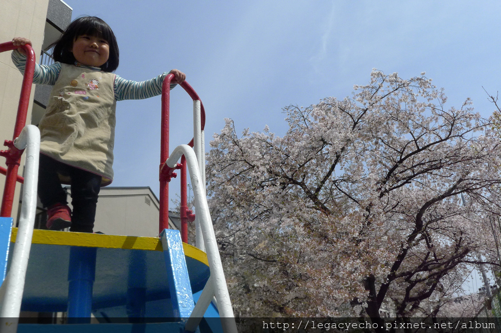 滑梯就在成排的櫻花樹之間,櫻花襯著藍天,風姿綽約。