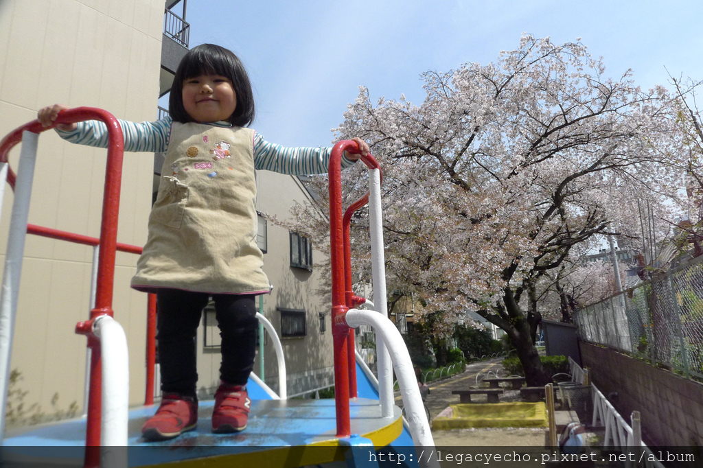 春櫻浪漫就在社區一隅,滑梯旁一株櫻花老樹,讓亮亮有一個與櫻花一起溜滑梯的經驗。