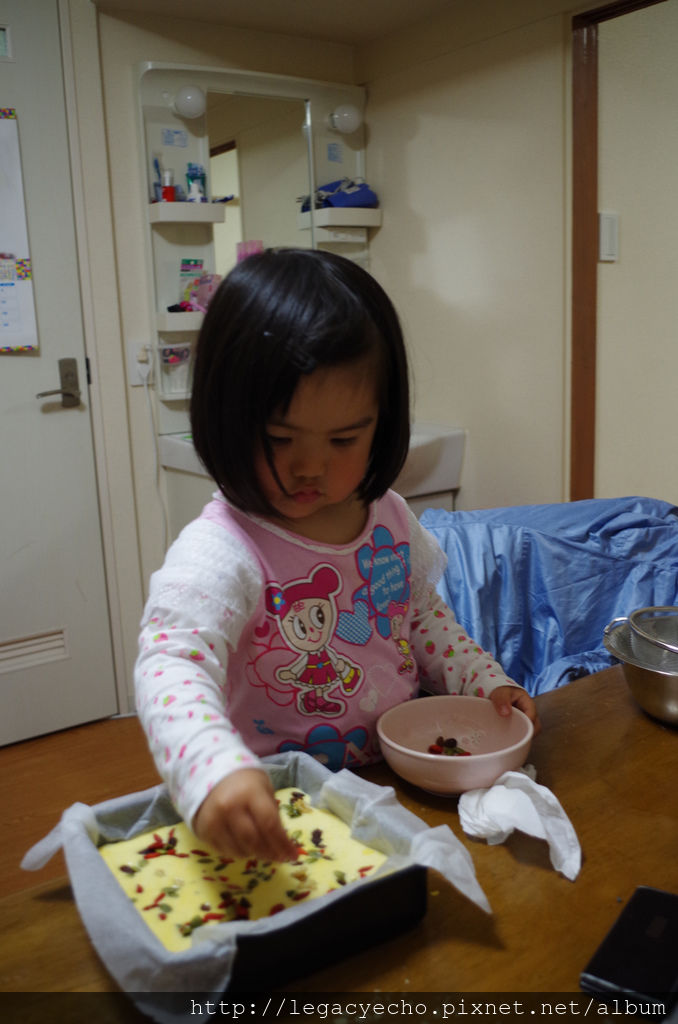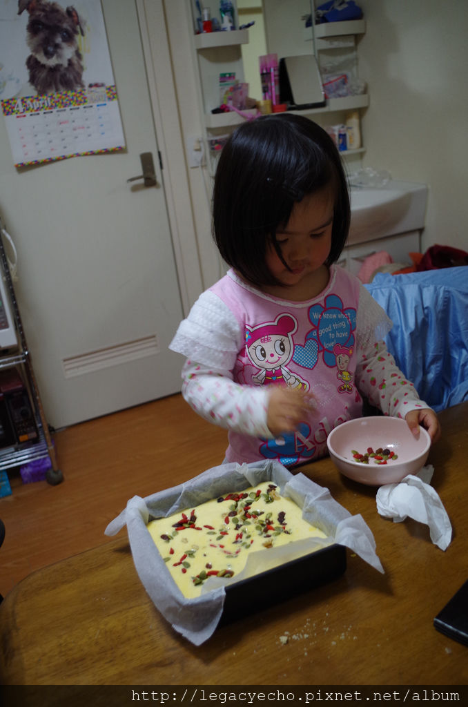 將麵糊放入烤盤並撒入少許堅果,放入烤箱。