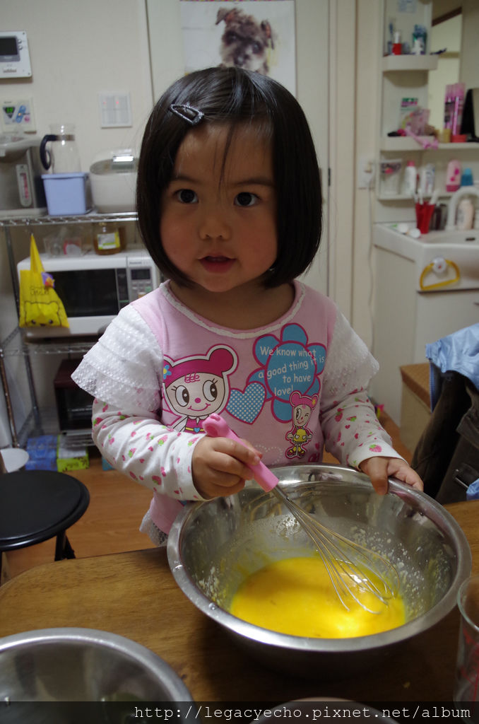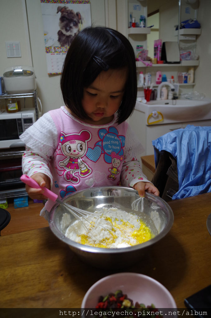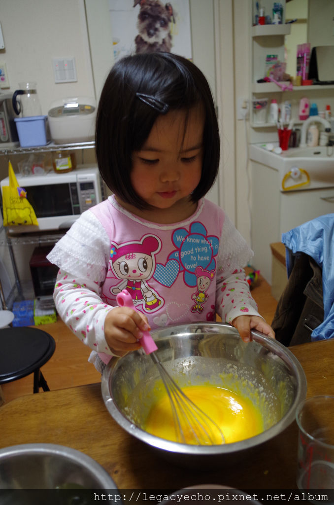 接著放入麵粉,輕輕攪拌,讓麵粉與蛋液融合。