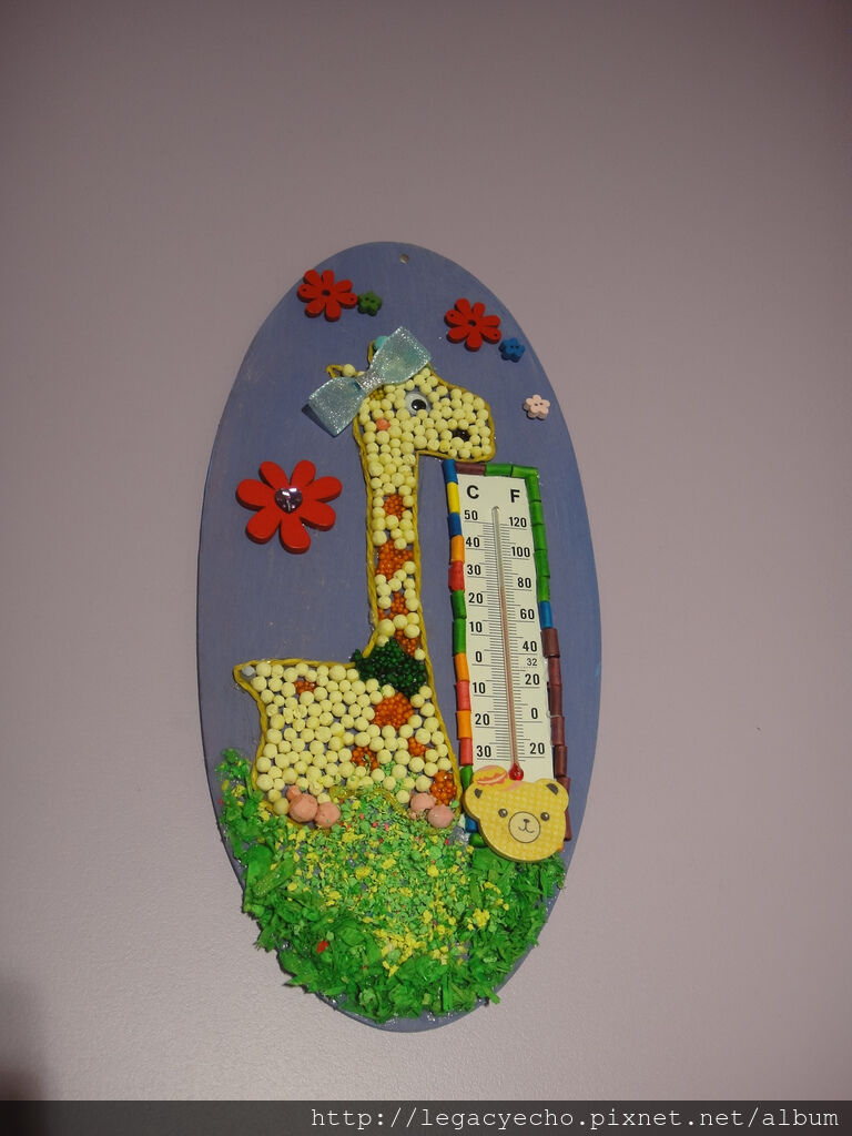 看到亮亮的作品了嗎?在薑餅屋上的長頸鹿溫度計。