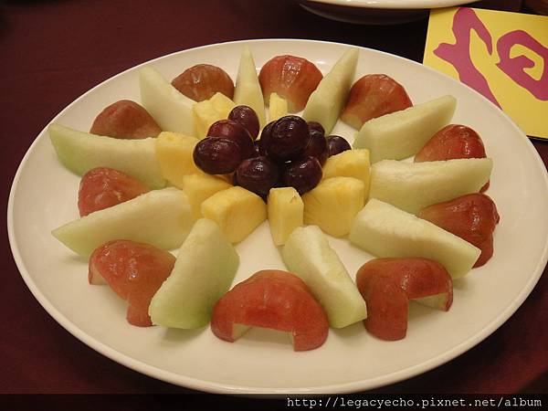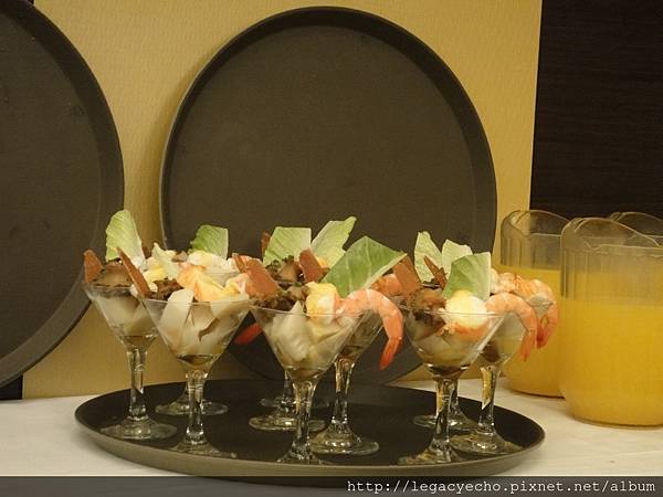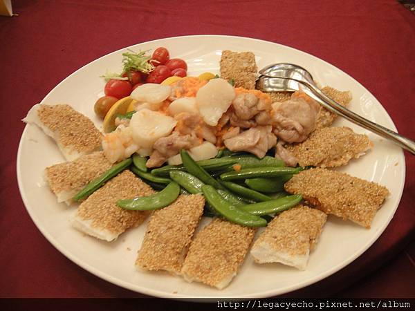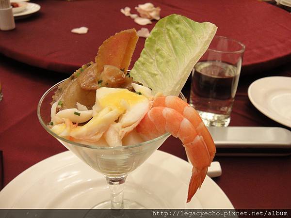 第一道菜是冷盤豪門引鳳來,用龍蝦及涼筍當底,上置烏魚子、九孔及白蝦,淋上芒果沙拉醬汁。