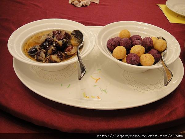 幸福常伴隨,這道菜是瑪瑙翡翠炒干貝龍鳳球及金芝箱根海鮮卷。