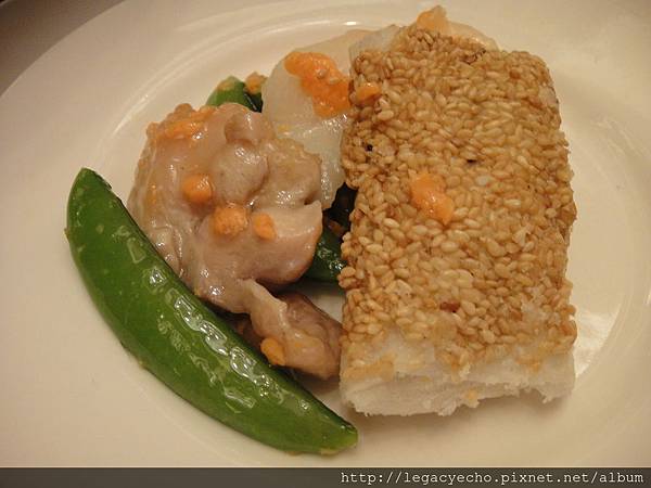 瑪瑙翡翠用的是蛋白和紅蘿蔔汁做成醬汁,炒干貝及蝦球。海鮮卷則以鋪滿芝麻為特色。