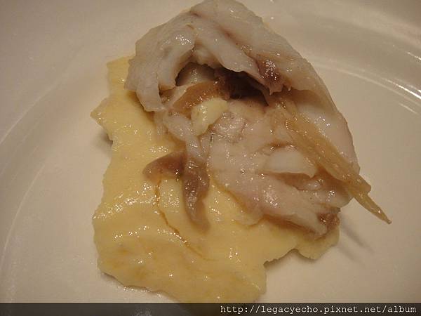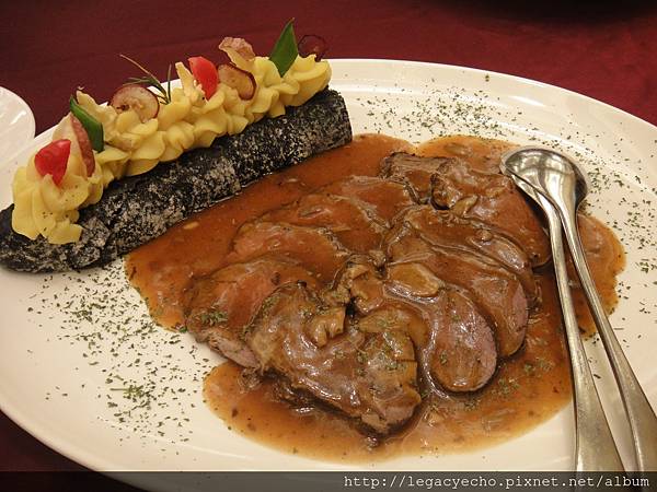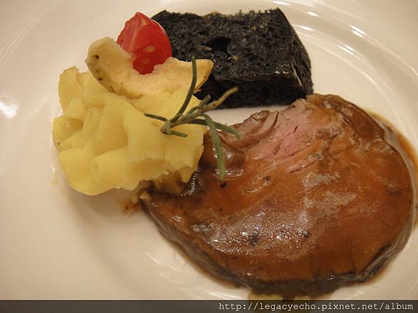 彩珠連綿綿,紅心牛菲力佐豉磨醬,利用豆豉做醬汁,讓洋式的菜餚有中式的風味,馬鈴薯泥做成盤飾。