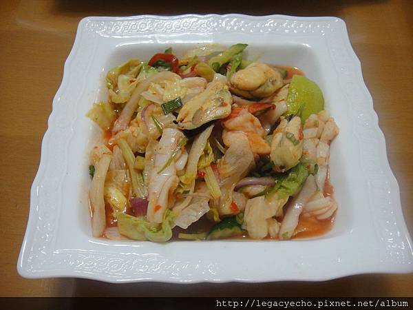 這個正方形的深盤,很適合拿來盛裝涼拌泡菜海鮮總匯,這是年夜飯的前菜沙拉。