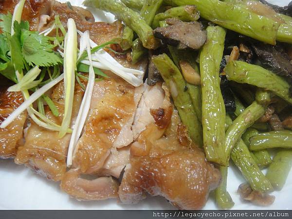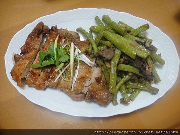 橢圓形的淺盤線條很美,裝上很平常的烤雞腿及蝦醬四季豆,整個質感完全大翻轉。