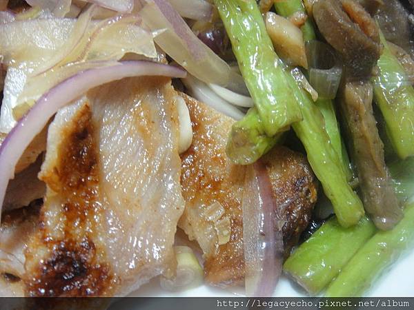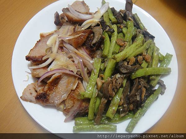 利用一個圓型平盤,盛裝洋蔥烤松阪豬肉配上蝦醬四季豆。