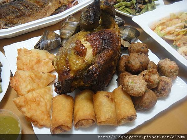 這隻雞是晶湯匙的年菜料理,搭配炸春捲、月亮蝦餅,竹葉蒸排骨及炸肉丸,做成拼盤。
