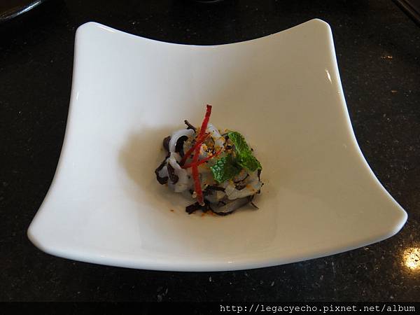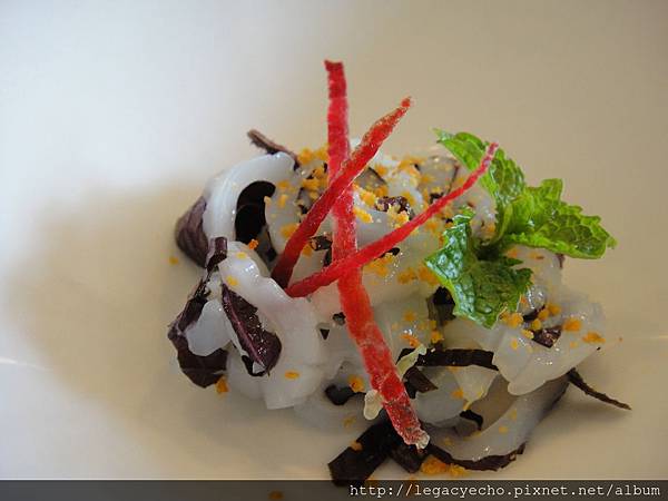 新鮮的烏賊,細緻的刀工,捲上紫蘇,佐以紅蘿蔔泥、紅椒、薄荷些許的點綴。