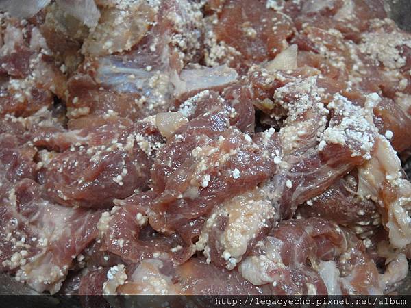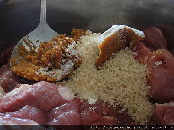 用陳釀醬油(壺底油)、甘蔗砂糖、味噌醃製。味噌的使用是大舅媽的獨門秘方,加了味噌之後的豬肉除了多一層隱約的大豆香外,發酵的味噌是否另外有使豬肉加倍軟Q的功效,不得而知。廚房永遠是主婦的實驗室,常常做,偶爾改一下配料,偶爾調整工序,到最後得心應手。