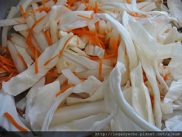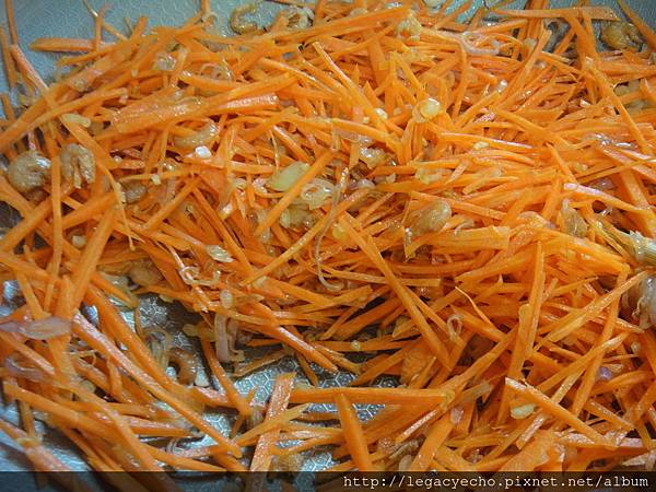 再加入紅蘿蔔絲一起拌炒,炒過的紅蘿蔔絲味道香甜,和直接放入水煮味道不同。