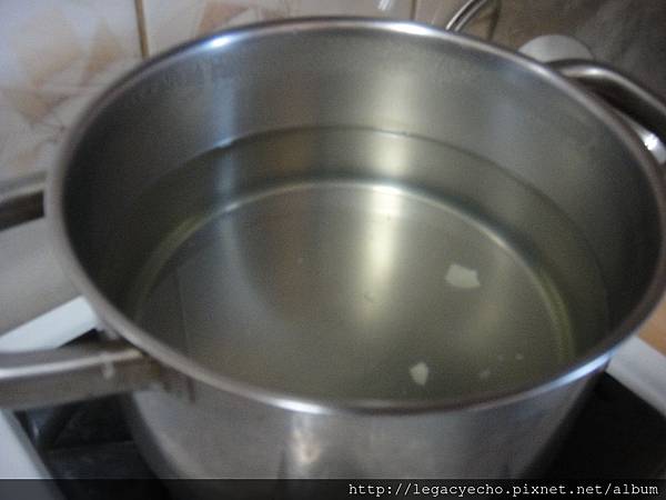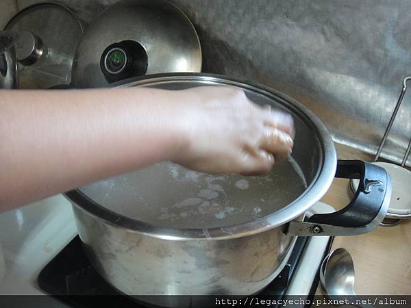 瓦斯爐上開始進行煨菜時,另燒一大鍋水,預備浮肉羹。