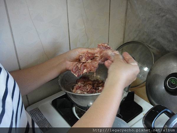 將肉條一塊塊放入滾開的水中,輕輕攪動水,避免沾黏。