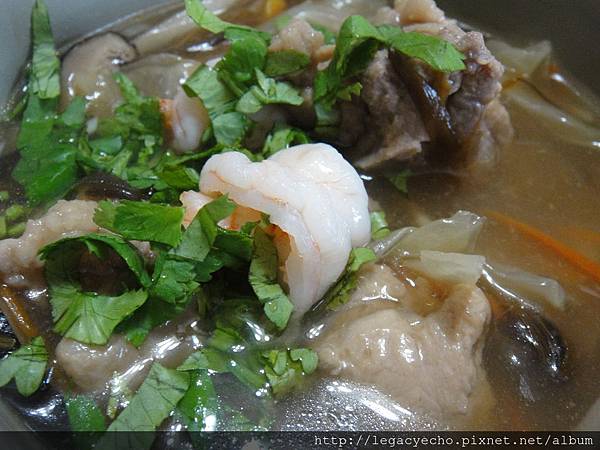 盛入湯碗時,上面放兩隻小蝦仁、少許蒜泥、白胡椒粉,再淋上少許烏醋,加上一點香菜,色香味俱全。