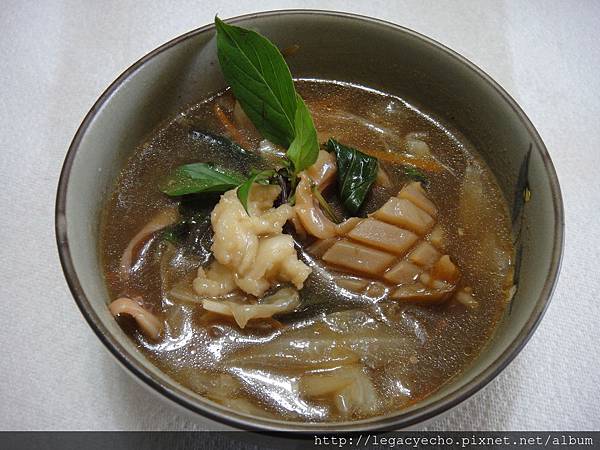因為阿蒂不吃豬肉,另外用剩下的花枝漿浮了花枝丸,再用煨菜的湯汁加入沙茶醬,番薯粉漿勾芡,放入花枝丸及魷魚,還有陽台種的九層塔,複刻了我懷念許久的士林夜市美食魷魚羹。