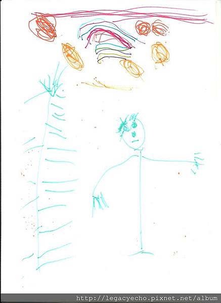 大約二個月前的一個星期日下午,亮亮畫好了一幅畫拿給我看,亮亮說:我畫了阿祖,阿祖站在樹下,天空有美麗的彩虹。