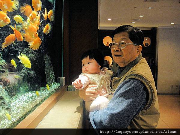 第一個聖誕節,阿祖抱著亮亮看魚,看聖誕樹。