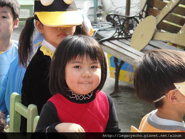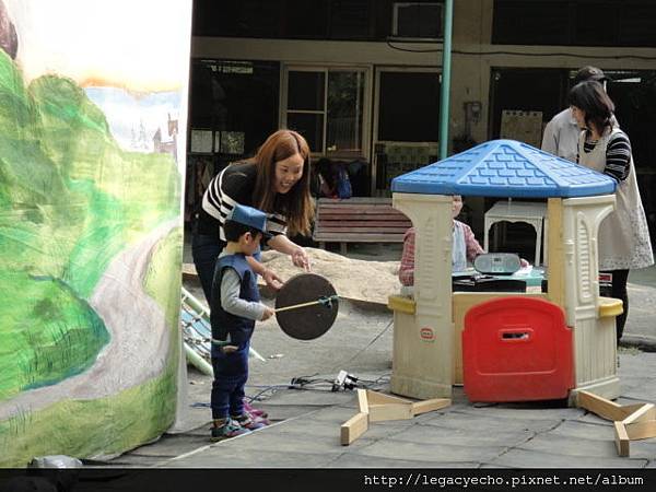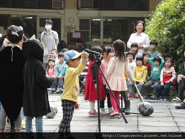 亮弟弟第一次到姊姊的幼兒園觀賞戲劇表演,東張西望一副好奇模樣。