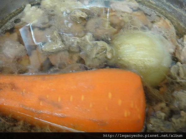 這次想做的是以牛肉為主的料理,三斤菊花牛肉,用兩顆洋蔥、一根紅蘿蔔先燉湯,到牛肉約八分軟嫩時熄火。