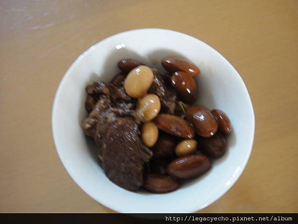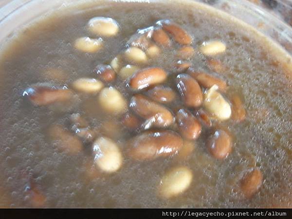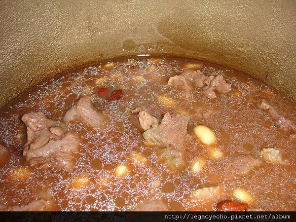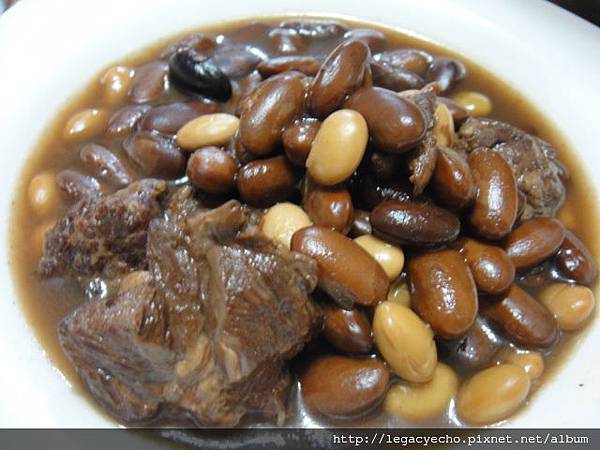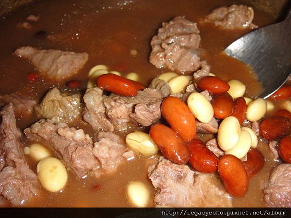 在燉牛肉湯前,先將曉彤公公種的有機花豆及家裡剩下的一點非基改黃豆各用保溫瓶熱水泡三個鐘頭,然後取出部分牛肉及湯與雙豆一起燉煮。