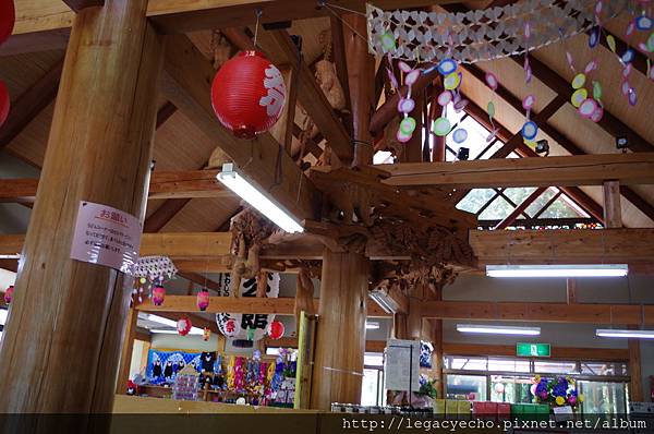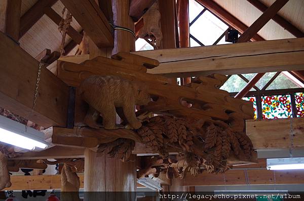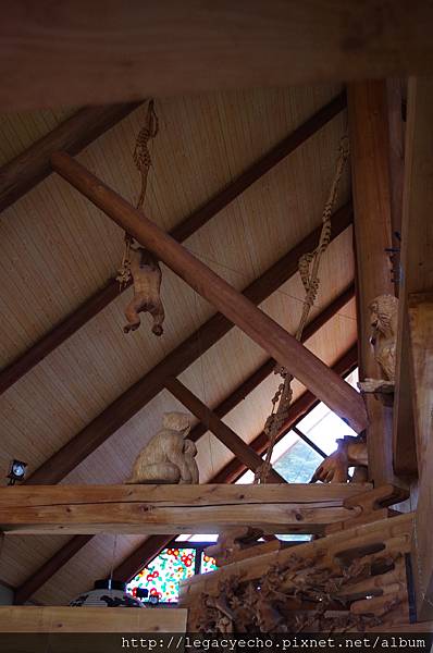 劇場大廳用原木蓋成,上面有許多栩栩如生的猴子雕刻。