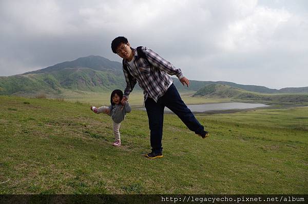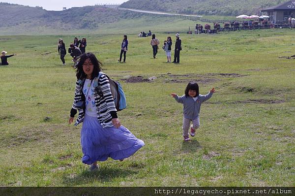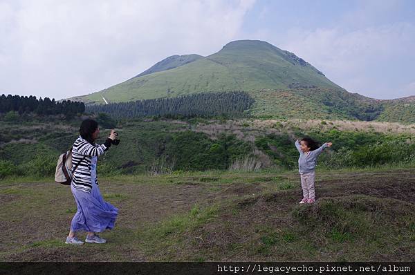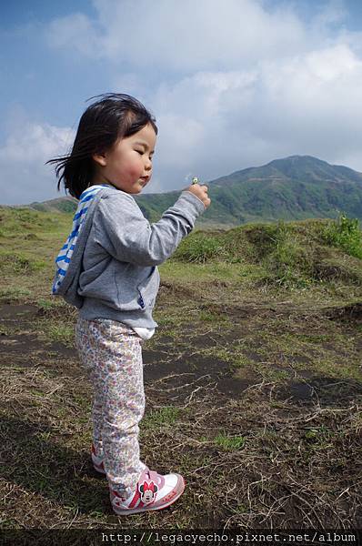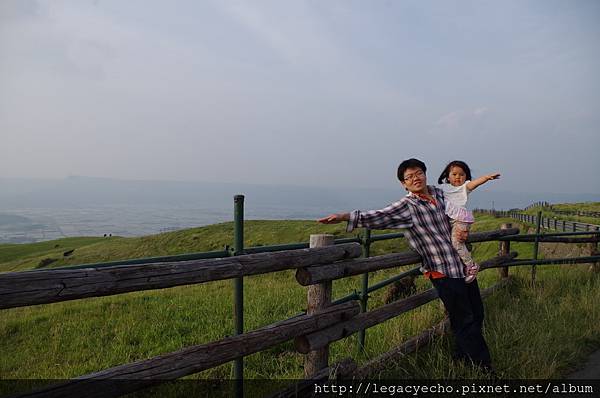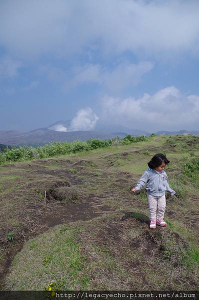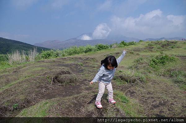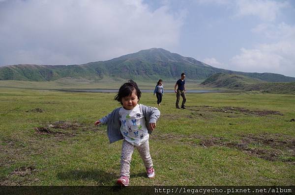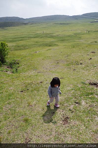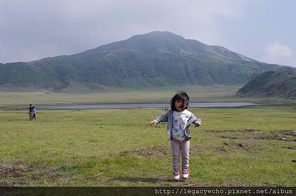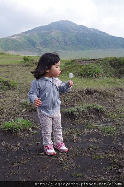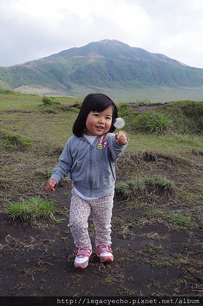 亮亮在熊本阿蘇火山旁的草千里,大草原上遍布蒲公英。