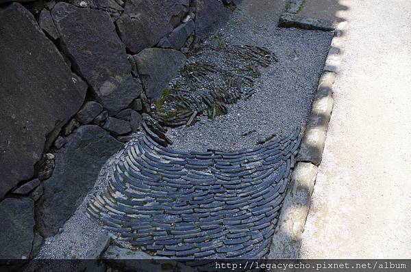 舊屋瓦砌成的水道圖案,防止雨水沖刷。