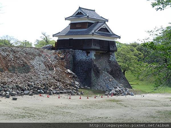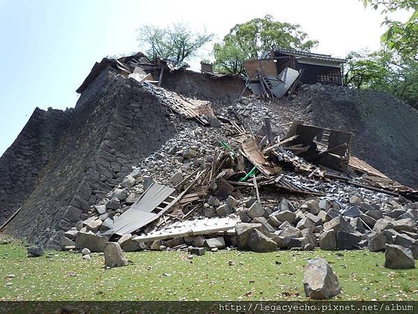一九六○年復舊重建的天守閣的屋瓦在第一次強震後開始剝落,第二震破損更劇,石垣崩塌、石塊滾落。