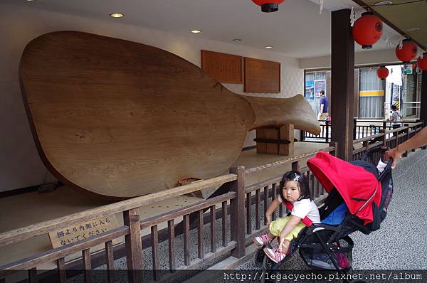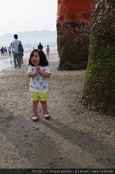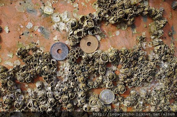 沾黏在大鳥居木頭上的貝殼及許願的銅板,形成特殊的景觀,對亮亮來說也是特別的眼界開展。